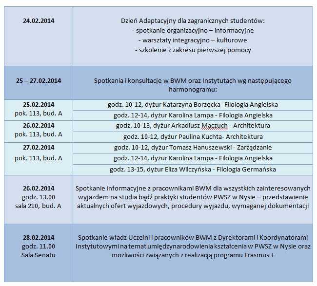 Od 24 lutego do 28 lutego 2014 w PWSZ w Nysie odbywać się będzie Erasmus Week. Z tej okazji Biuro Współpracy Międzynarodowej promować będzie wyjazdy w ramach programu LLP Erasmus, jak również nowego sektorowego programu Erasmus +. Ponadto odbędą się spotkania informacyjne oraz konsultacje z koordynatorami oraz studentami, którzy skorzystali z programu LLP Erasmus, spotkania z zagranicznymi studentami, którzy przebywają w PWSZ w Nysie, dzień adaptacyjny dla zagranicznych studentów oraz spotkanie władz Uczelni i pracowników BWM z Dyrektorami i Koordynatorami Instytutowymi na temat umiędzynarodowienia kształcenia w PWSZ w Nysie oraz możliwości związanych z realizacją programu Erasmus + w latach 2014-2020.