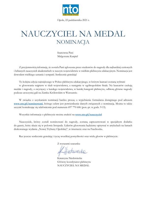 Miło nam poinformować, że wykładowczyni Instytutu Neofilologii PWSZ w Nysie, Pani Małgorzata Kurpiel uzyskała nominację do nagrody w Wielkim Plebiscycie Edukacyjnym Nauczyciel Akademicki Roku. Jest to największy ogólnopolski i regionalny plebiscyt edukacyjny. Lokalnie konkurs prowadzony jest na łamach Nowej Trybuny Opolskiej a wszelkie informacje o plebiscycie można znaleźć na stronie www.nto.pl/nauczyciel