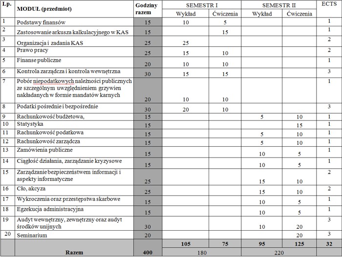 Program studiów obejmuje najważniejsze elementy procesu organizacji oraz zarządzania w Krajowej Administracji Skarbowej. Pozwoli on przyszłym pracownikom na przygotowanie się do procesu rekrutacji i służby przygotowawczej, a kadrze zatrudnionej już w KAS na poszerzenie wiedzy i umiejętności z zakresu funkcjonowania i procesu zarządzania.