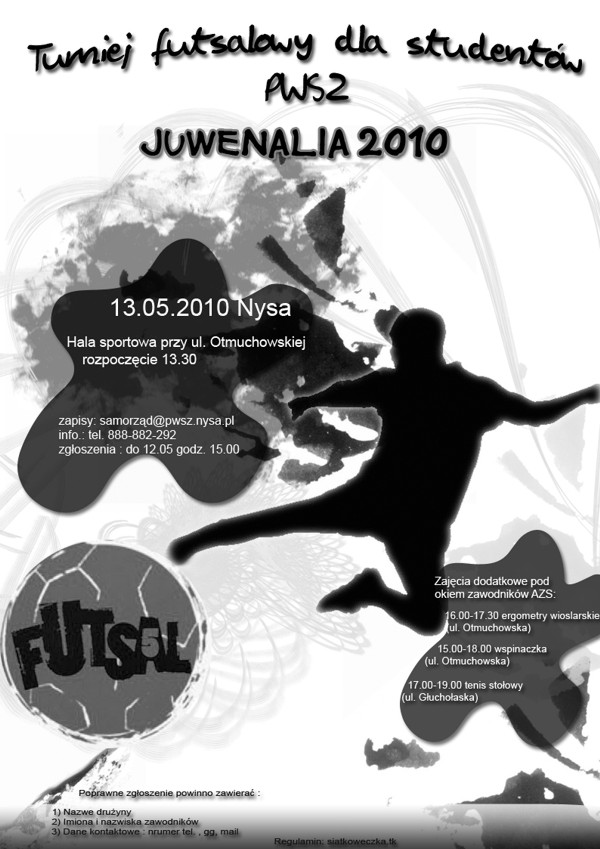Serdecznie zapraszamy do wzięcia udziału w turnieju futsalowy dla studentów PWSZ. Zobacz poniżej plakat z programem imprezy (kliknij aby powiększyć).