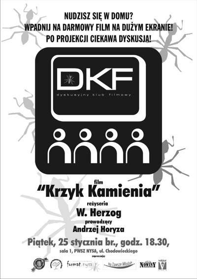 Nudzisz się w domu? Chcesz odpocząć przed kolejnym egzaminem? Wpadnij na darmowy film na dużym ekranie! Dział Współpracy Międzynarodowej i Promocji. Biuro Karier i Samorząd Studencki zapraszają na spotkanie Dyskusyjnego Klubu Filmowego, dnia 25.01.2008 o godz. 18:30 w sali nr 1A (budynek główny) w ramach którego, wyświetlony zostanie film: „Krzyk Kamienia”, reżyseria W. Herzog. Po projekcji ciekawą dyskusję poprowadzi Andrzej Horyza.