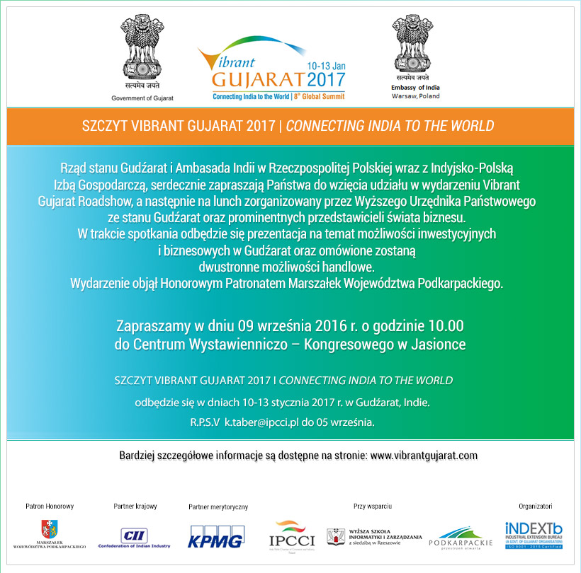 Wysokiej rangi urzędnicy i kadra zarządzająca największych firm indyjskich będzie gościła w Polsce w dniach 8-10/09. Celem wizyty jest zapoznanie się z potencjałem polskim, przedstawienie możliwości współpracy na rynku indyjskim i zaproszenie na mega wydarzenie - Vibrat Gujarat.