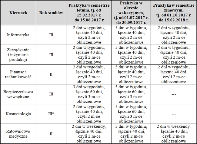 Na wszystkich kierunkach studiów, w ramach których zakładana jest realizacja praktyki w tygodniu, podczas semestru, zajęcia zostaną ułożone w taki sposób, aby studenci posiadali wymaganą liczbę dni wolnych w tygodniu do uczestniczenia w praktykach.