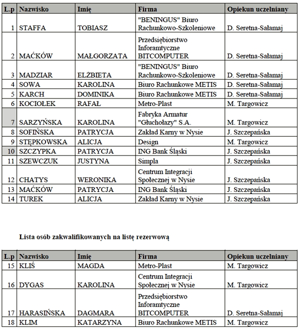 Osoby zakwalifikowane na listę rezerwową będą mogły wziąć udział w projekcie po otrzymaniu zgody Ministerstwa na zwiększenie liczby miejsc praktyk na danym kierunku studiów.
