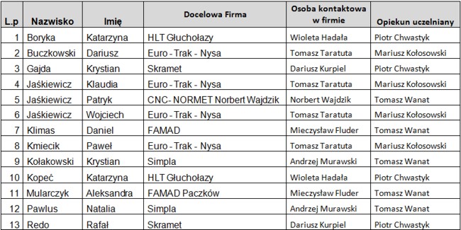 W ramach przeprowadzonego drugiego naboru studentów do udziału w Programie praktyk zawodowych w Państwowych Wyższych Szkołach Zawodowych", realizowanym w ramach PO WER - Oś III Szkolnictwo Wyższe dla gospodarki i rozwoju, komisja konkursowa zakwalifikowała następujących studentów z II roku Kierunku Zarządzanie i Inżynieria Produkcji do udziału w projekcie.