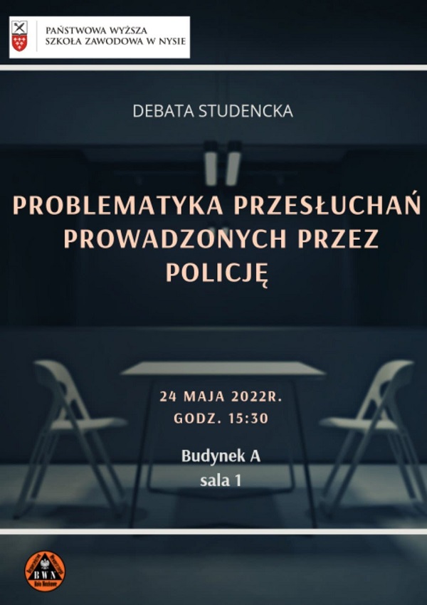 24 maja 2022 roku o godzinie 15:30 w sali nr 101 budynku A naszej Uczelni odbędzie się debata studencka nt. „Problematyka przesłuchań prowadzonych przez Policję”. Debata jest organizowana przez koło naukowe BWN, działające na Wydziale Nauk Społecznych. To wydarzenie zostało przygotowane w ramach grupy naukowej koła.